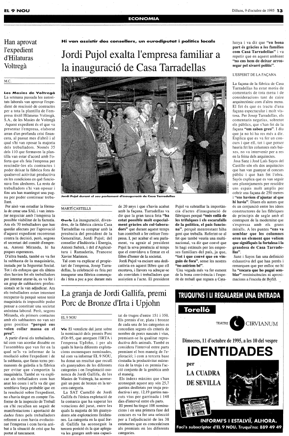 La inauguració, divendres, de la fàbrica càrnia Casa Tarradellas va comptar amb la presència del president de la Generalitat, Jordi Pujol; del conseller d’Indústria i Energia, Antoni Subirà, i del d’Agricultura i Ramaderia, Francesc Xavier Marimon.