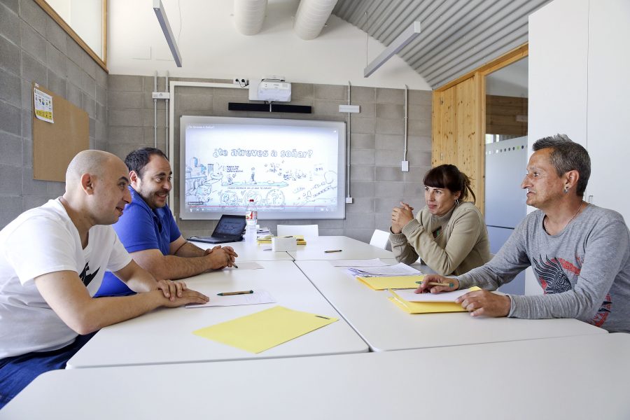 En Patriç, a la dreta, amb dos altres usuaris i la seva educadora d’habilitats psicosocials, Memi Martínez | Albert Llimós