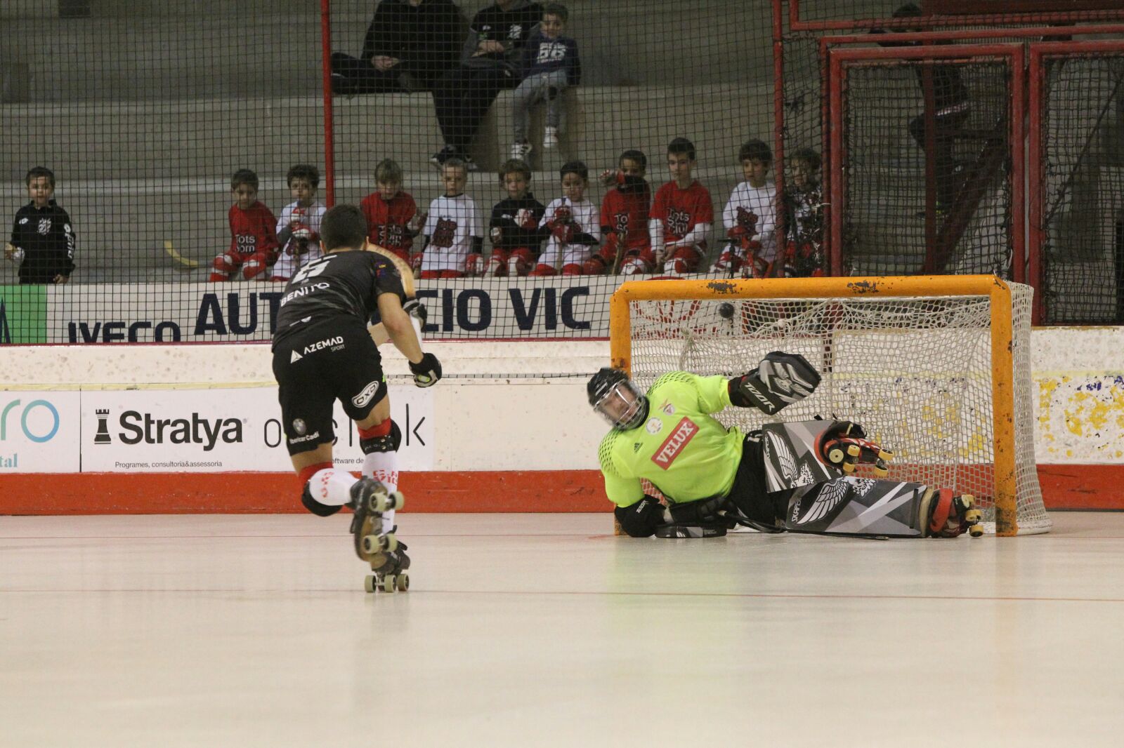 El Vic ha aconseguit un còmode avantatge a la primera part (4-0) gràcies als gols inicials de Mia Ordeig i Cristina Rodríguez i als penals transformats per Rodríguez i Romà Bancells. Però just abans del descans, el Benfica ha escurçat distàncies. A la segona part, el Vic ha notat el cansament i ha estat desencertat. Els portuguesos mica en mica han anat eixugant la diferència. Els osonencs han desaprofitat una falta directa, fruit de la desensa falta portuguesa, i han jugat els últims segons amb superioritat numèrica, per l’exclusió dos jugadors del Benfica, però no han pogut desequilibrar el marcador. Ara es jugaran l’accés als quarts de final de la Lliga europea en l’últim partit a la pista del Lodi italià, l’altre equip que opta a ser segon de grup i que va aconseguir empatar a l’Olímpic de Vic a la primera volta.