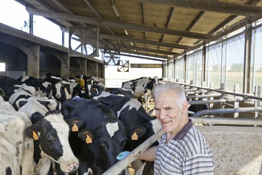 Agustí Prat amb algunes de les vaques de llet, en un dels coberts amb ventilació del Mas la Cavalleria | Albert Llimós
