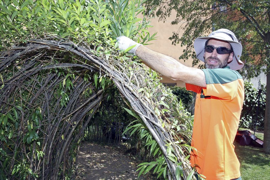 Els termòmetres marcaven 36 graus dimecres a la tarda quan Jordi Vilar, oficial jardiner de l’Ajuntament de Vic, retallava part del túnel vegetal del pati de l’escola bressol dels Caputxins, una tasca que havia iniciat al matí. Vilar és una de les moltes persones que treballen a fora i que per aquest motiu noten les inclemències del temps durant la seva jornada laboral, ja sigui una onada de calor com la d’aquesta setmana, el fred de l’hivern o les pluges. Ell, però, és optimista i per això “miro de no pensar gaire que fa calor, si pensem que fa calor ja l’hem fomuda”, deia. Tot i això, quan “ve de cop es nota bastant” però “em mentalitzo que fa calor i ja està”, ja que “si ho poso al punt negatiu hauria de plegar”.