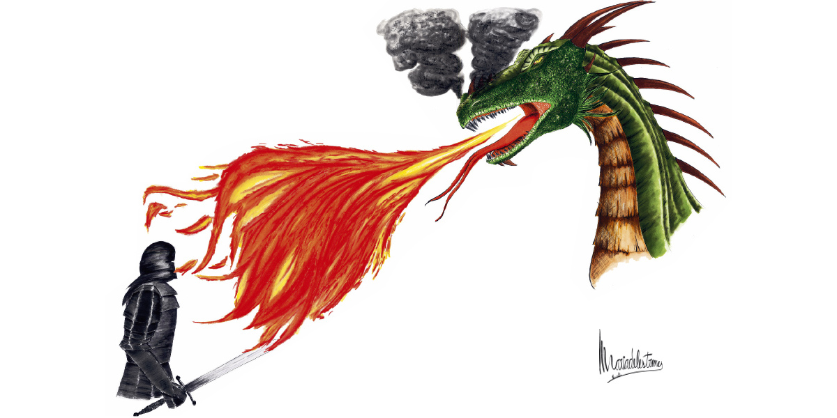 Pocs vaticinaven un duel tan poc competit. El cavaller s’ha presentat davant la cova del drac amb una armadura rutilant que de tan pesada l’obligava a caminar encarcarat. L’acompanyava un dringar de quincalla més propi d’un venedor ambulant que d’un coratjós cavaller. Els espectadors més burletes se’n reien, els més compassius exigien respecte: tots s’ensumaven una nova desgràcia. Cada setmana apareixia algun valent que desafiava la bèstia. Venien atrets per dos reclams: d’una banda l’afany de la glòria de vèncer el drac que tiranitzava el regne amb la seva fam insaciable de donzelles; de l’altra, la mà de la filla del rei, la princesa de llargs cabells daurats que el rei oferiria a qui els deslliurés de la bèstia. Normalment, els enfrontaments presentaven poques variacions: el cavaller esperava palplantat davant la cova, tibat, l’espasa en una mà, les brides del cavall en l’altra. Llavors venia la fogonada, un esclat de foc que fonia el metall de l’armadura i que reduïa cavaller i cavall a un munt de cendra i ferralla.