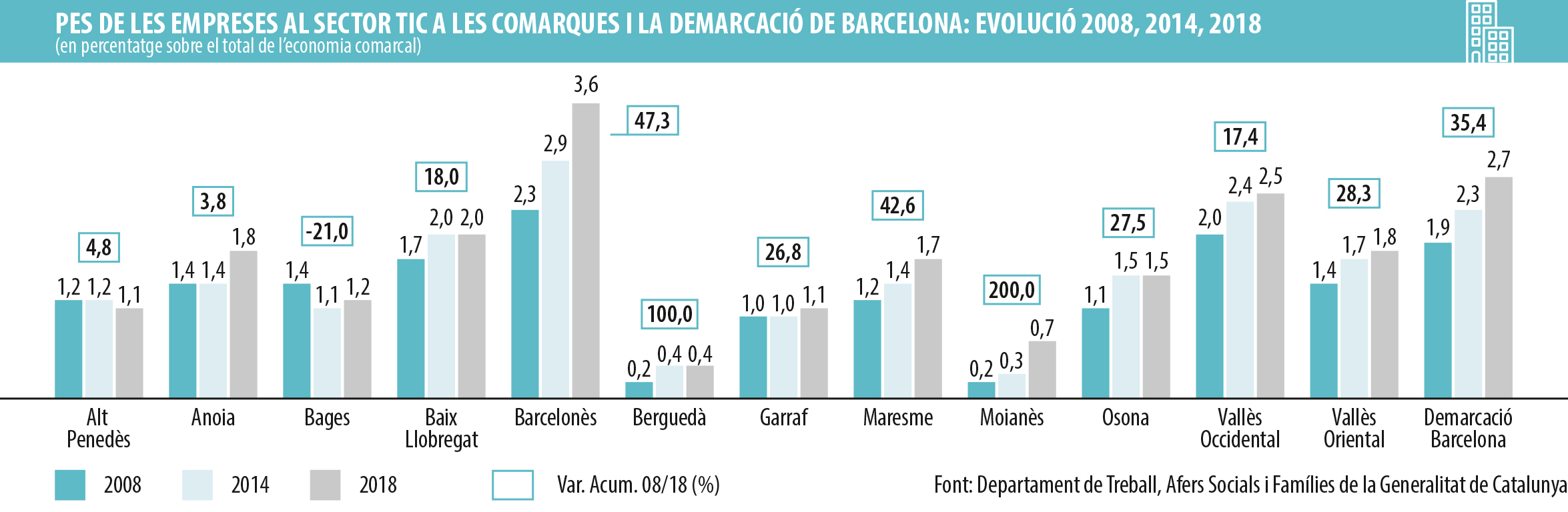 De les 13 comarques que la configuren, on més és present el sector tant pel que fa a les afiliacions com al nombre d’empreses és a les comarques del Barcelonès, el Vallès Occidental, el Vallès Oriental, l’Anoia i el Baix Llobregat. Ni Osona ni el Moianès no són als primers cinc llocs del rànquing. Osona se situa en la sisena posició mentre que el Moianès és l’última. El percentatge de la distribució comarcal de les empreses del sector TIC a Osona és de l’1,7%, mentre que al Moianès és només del 0,1%. Pel que fa les afiliacions, el percentatge osonenc és de l’1,2%, el mateix que el de la mitjana de la demarcació, mentre que el del Moianès és del 0,02%, la taxa més baixa de les 13 comarques.