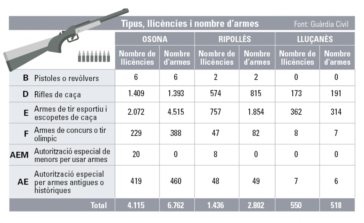 Tant a Osona, com el Ripollès o el Lluçanès –són el 90%– predominen les armes de llicència E (escopetes de caça, ratllades per a tir esportiu del calibre 5,56, ballestes o armes per llançar caps) i després les de llicència D (rifles per a la caça major).