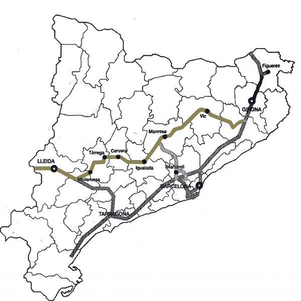 L’eix transversal ferroviari, en alguns trams paral·lel a la C-25, havia de connectar Lleida i Girona en una hora i vint minuts. Es tracta d’un projecte que la Generalitat ha aparcat, almenys ara per ara, però que continua present en planejaments com el Pla Territorial Parcial de les Comarques Centrals de l’any 2008. Requeria una inversió estimada de 6.500 milions d’euros. I el traçat no agradava a tothom: Gurb, per exemple, demanava que l’estació projectada al municipi es traslladés a Vic. L’Ajuntament de Torelló i el de Manlleu volien que el tren parés a les seves poblacions, seguint un recorregut en què l’entrada a la Garrotxa passés per la Vall del Ges. El 2004 la Generalitat havia fixat un termini de 20 anys per construir-lo.