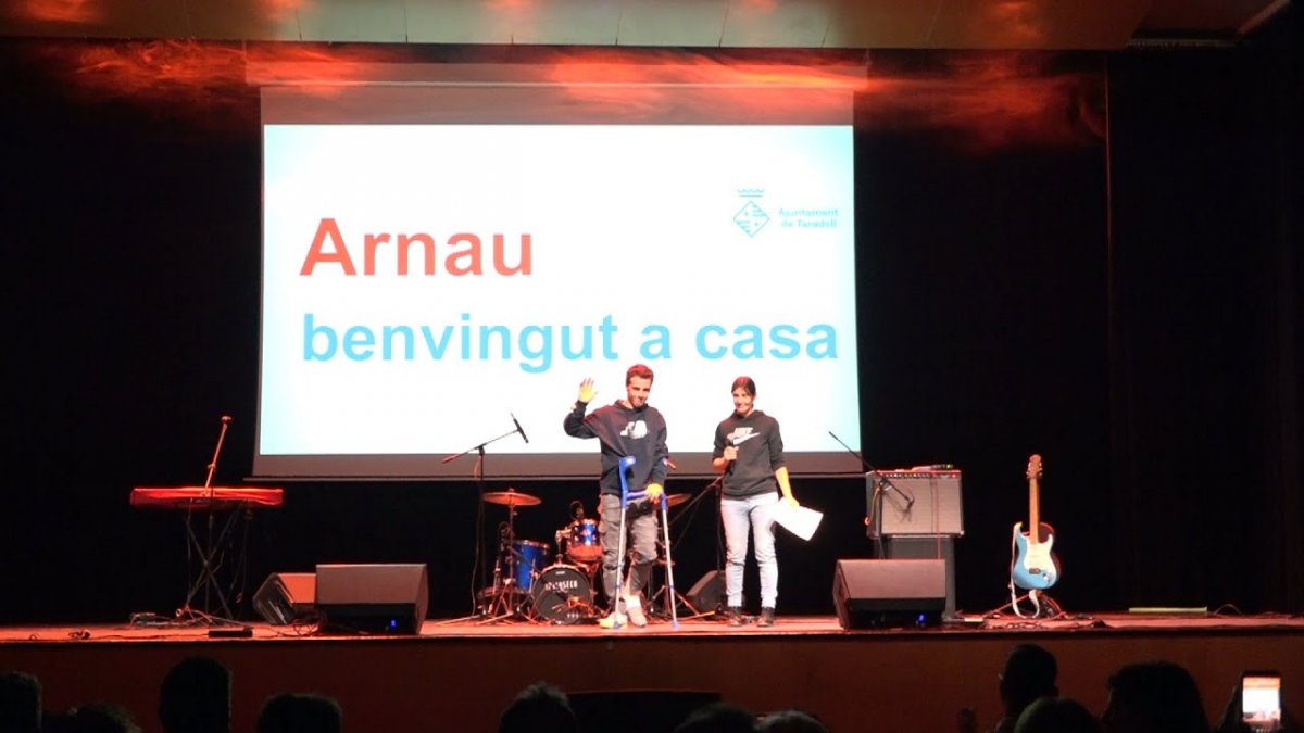 Una pancarta on es podia llegir ‘Arnau, benvingut a Casa’, rebia a Arnau Lledó al vestíbul de Can Costa de Taradell. A l’interior, 200es persones van ovacionar al taradellenc quan va sortir a l’escenari, en un acte de benvinguda després d’haver tornat a casa abans d’hora per una caiguda al Dakar.
