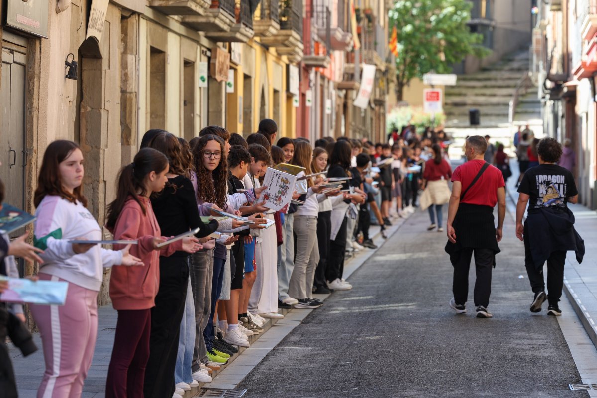 Els llibres han anat passant de mans en una extensa cadena humana que ha ocupat diversos carrers del municipi. Així, l’obertura de portes de la nova biblioteca cada vegada està més a prop.