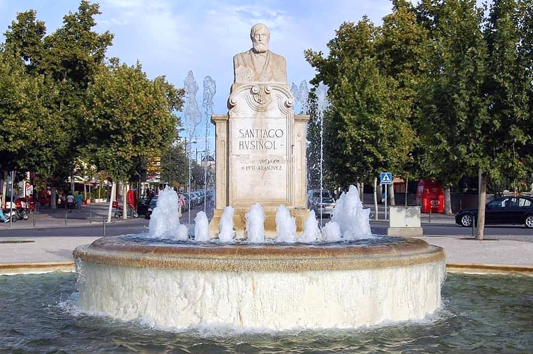 En primer lloc, qui subscriu va néixer a Aranjuez. Des de la infància es va acostumar a veure una estàtua situada a l’entrada del poble, just davant de l’Oficina de Turisme i envoltada de jardins. Aquest bust d’un home amb cognom d’ocell (transformat en Ruiseñor), de mirada severa, congelada en pedra, era la imatge d’un pintor català. Enamorat d’Aranjuez, havia mort a l’habitació d’un hotel del poble, com explicava una placa situada a la façana de l’establiment: “Aquí vivió y murió Santiago Rusiñol, genial pintor de los jardines de Aranjuez. 13 de Junio de 1931”.