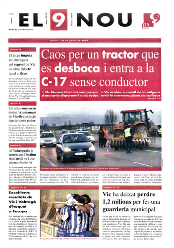 20040126 20040126 | El 9 Nou 26/01/2004 Notícies relacionades LA PREGUNTA Veu bé que el president dels bisbes espanyols opini sobre política? Sí No En aquesta enquesta han votat 288 persones. Vota Les + vistes Set detinguts i una vintena de denúncies en un dispositiu Kanpai contra la multireincidència a Vic i Manlleu La febre per trobar el número de loteria de l'anunci d'un torró ha arribat fins a Tona Fan malbé el ninot de l'escola Joan Maragall de Ripoll Obriran un centre privat de diagnòstic per la imatge a Vic amb una inversió de 6 milions d'euros Girbau celebra un dinar de jubilats a les portes de Nadal El personal sanitari del CAP del Remei de Vic fa un pessebre vivent solidari Osona Ripolles Els pobles osonencs que pertanyen a Girona no es plantegen demanar un canvi de província La Generalitat confirma el futur Palau de Justícia a l’Era d’en Sellés de Vic Aliança Catalana aconsegueix a última hora els suports per salvar 2,7 milions d'Europa per la nau del Pla de Ripoll