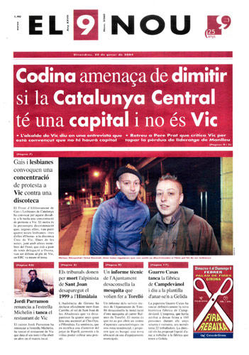 20040130 20040130 | El 9 Nou 30/01/2004 Notícies relacionades LA PREGUNTA Veu bé que el president dels bisbes espanyols opini sobre política? Sí No En aquesta enquesta han votat 288 persones. Vota Les + vistes Set detinguts i una vintena de denúncies en un dispositiu Kanpai contra la multireincidència a Vic i Manlleu La febre per trobar el número de loteria de l'anunci d'un torró ha arribat fins a Tona Fan malbé el ninot de l'escola Joan Maragall de Ripoll Obriran un centre privat de diagnòstic per la imatge a Vic amb una inversió de 6 milions d'euros Girbau celebra un dinar de jubilats a les portes de Nadal El personal sanitari del CAP del Remei de Vic fa un pessebre vivent solidari Osona Ripolles Els pobles osonencs que pertanyen a Girona no es plantegen demanar un canvi de província La Generalitat confirma el futur Palau de Justícia a l’Era d’en Sellés de Vic Aliança Catalana aconsegueix a última hora els suports per salvar 2,7 milions d'Europa per la nau del Pla de Ripoll