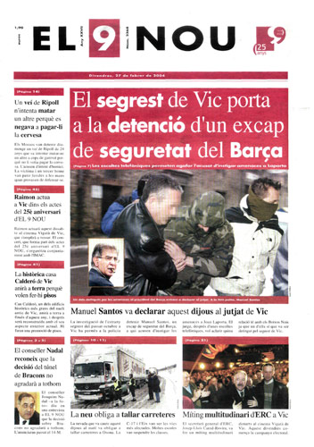 20040227 20040227 | El 9 Nou 27/02/2004 Notícies relacionades LA PREGUNTA Veu bé que el president dels bisbes espanyols opini sobre política? Sí No En aquesta enquesta han votat 288 persones. Vota Les + vistes Set detinguts i una vintena de denúncies en un dispositiu Kanpai contra la multireincidència a Vic i Manlleu La febre per trobar el número de loteria de l'anunci d'un torró ha arribat fins a Tona Fan malbé el ninot de l'escola Joan Maragall de Ripoll Obriran un centre privat de diagnòstic per la imatge a Vic amb una inversió de 6 milions d'euros Girbau celebra un dinar de jubilats a les portes de Nadal El personal sanitari del CAP del Remei de Vic fa un pessebre vivent solidari Osona Ripolles Els pobles osonencs que pertanyen a Girona no es plantegen demanar un canvi de província La Generalitat confirma el futur Palau de Justícia a l’Era d’en Sellés de Vic Aliança Catalana aconsegueix a última hora els suports per salvar 2,7 milions d'Europa per la nau del Pla de Ripoll