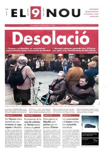 20040312 20040312 | El 9 Nou 12/03/2004 Notícies relacionades LA PREGUNTA Veu bé que el president dels bisbes espanyols opini sobre política? Sí No En aquesta enquesta han votat 283 persones. Vota Les + vistes Set detinguts i una vintena de denúncies en un dispositiu Kanpai contra la multireincidència a Vic i Manlleu La febre per trobar el número de loteria de l'anunci d'un torró ha arribat fins a Tona Fan malbé el ninot de l'escola Joan Maragall de Ripoll Obriran un centre privat de diagnòstic per la imatge a Vic amb una inversió de 6 milions d'euros Girbau celebra un dinar de jubilats a les portes de Nadal El personal sanitari del CAP del Remei de Vic fa un pessebre vivent solidari Osona Ripolles Els pobles osonencs que pertanyen a Girona no es plantegen demanar un canvi de província La Generalitat confirma el futur Palau de Justícia a l’Era d’en Sellés de Vic Aliança Catalana aconsegueix a última hora els suports per salvar 2,7 milions d'Europa per la nau del Pla de Ripoll