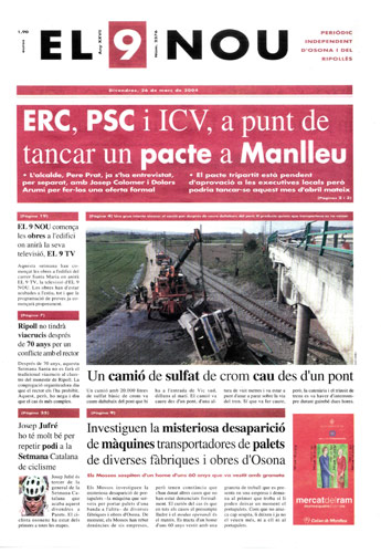 20040326 20040326 | El 9 Nou 26/03/2004 Notícies relacionades LA PREGUNTA Veu bé que el president dels bisbes espanyols opini sobre política? Sí No En aquesta enquesta han votat 283 persones. Vota Les + vistes Set detinguts i una vintena de denúncies en un dispositiu Kanpai contra la multireincidència a Vic i Manlleu La febre per trobar el número de loteria de l'anunci d'un torró ha arribat fins a Tona Fan malbé el ninot de l'escola Joan Maragall de Ripoll Obriran un centre privat de diagnòstic per la imatge a Vic amb una inversió de 6 milions d'euros Girbau celebra un dinar de jubilats a les portes de Nadal El personal sanitari del CAP del Remei de Vic fa un pessebre vivent solidari Osona Ripolles Els pobles osonencs que pertanyen a Girona no es plantegen demanar un canvi de província La Generalitat confirma el futur Palau de Justícia a l’Era d’en Sellés de Vic Aliança Catalana aconsegueix a última hora els suports per salvar 2,7 milions d'Europa per la nau del Pla de Ripoll