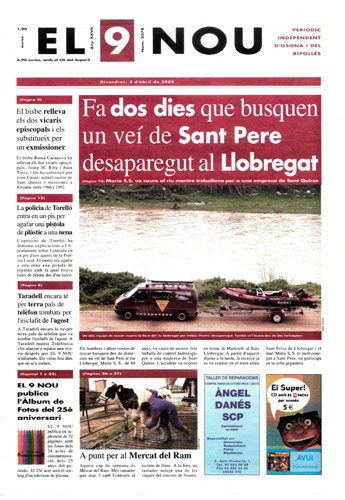 20040402 20040402 | El 9 Nou 02/04/2004 Notícies relacionades LA PREGUNTA Veu bé que el president dels bisbes espanyols opini sobre política? Sí No En aquesta enquesta han votat 283 persones. Vota Les + vistes Set detinguts i una vintena de denúncies en un dispositiu Kanpai contra la multireincidència a Vic i Manlleu La febre per trobar el número de loteria de l'anunci d'un torró ha arribat fins a Tona Fan malbé el ninot de l'escola Joan Maragall de Ripoll Obriran un centre privat de diagnòstic per la imatge a Vic amb una inversió de 6 milions d'euros Girbau celebra un dinar de jubilats a les portes de Nadal El personal sanitari del CAP del Remei de Vic fa un pessebre vivent solidari Osona Ripolles Els pobles osonencs que pertanyen a Girona no es plantegen demanar un canvi de província La Generalitat confirma el futur Palau de Justícia a l’Era d’en Sellés de Vic Aliança Catalana aconsegueix a última hora els suports per salvar 2,7 milions d'Europa per la nau del Pla de Ripoll