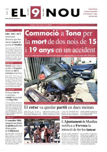 20040426 20040426 | El 9 Nou 26/04/2004 Notícies relacionades LA PREGUNTA Veu bé que el president dels bisbes espanyols opini sobre política? Sí No En aquesta enquesta han votat 283 persones. Vota Les + vistes Set detinguts i una vintena de denúncies en un dispositiu Kanpai contra la multireincidència a Vic i Manlleu La febre per trobar el número de loteria de l'anunci d'un torró ha arribat fins a Tona Fan malbé el ninot de l'escola Joan Maragall de Ripoll Obriran un centre privat de diagnòstic per la imatge a Vic amb una inversió de 6 milions d'euros Girbau celebra un dinar de jubilats a les portes de Nadal El personal sanitari del CAP del Remei de Vic fa un pessebre vivent solidari Osona Ripolles Els pobles osonencs que pertanyen a Girona no es plantegen demanar un canvi de província La Generalitat confirma el futur Palau de Justícia a l’Era d’en Sellés de Vic Aliança Catalana aconsegueix a última hora els suports per salvar 2,7 milions d'Europa per la nau del Pla de Ripoll