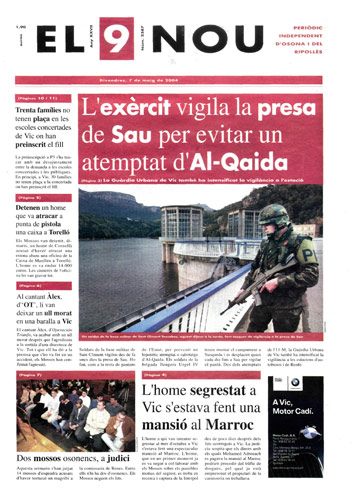 20040507 20040507 | El 9 Nou 07/05/2004 Notícies relacionades LA PREGUNTA Veu bé que el president dels bisbes espanyols opini sobre política? Sí No En aquesta enquesta han votat 283 persones. Vota Les + vistes Set detinguts i una vintena de denúncies en un dispositiu Kanpai contra la multireincidència a Vic i Manlleu La febre per trobar el número de loteria de l'anunci d'un torró ha arribat fins a Tona Fan malbé el ninot de l'escola Joan Maragall de Ripoll Obriran un centre privat de diagnòstic per la imatge a Vic amb una inversió de 6 milions d'euros Girbau celebra un dinar de jubilats a les portes de Nadal El personal sanitari del CAP del Remei de Vic fa un pessebre vivent solidari Osona Ripolles Els pobles osonencs que pertanyen a Girona no es plantegen demanar un canvi de província La Generalitat confirma el futur Palau de Justícia a l’Era d’en Sellés de Vic Aliança Catalana aconsegueix a última hora els suports per salvar 2,7 milions d'Europa per la nau del Pla de Ripoll