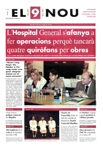 20040524 20040524 | El 9 Nou 24/05/2004 Notícies relacionades LA PREGUNTA Veu bé que el president dels bisbes espanyols opini sobre política? Sí No En aquesta enquesta han votat 288 persones. Vota Les + vistes Set detinguts i una vintena de denúncies en un dispositiu Kanpai contra la multireincidència a Vic i Manlleu La febre per trobar el número de loteria de l'anunci d'un torró ha arribat fins a Tona Fan malbé el ninot de l'escola Joan Maragall de Ripoll Obriran un centre privat de diagnòstic per la imatge a Vic amb una inversió de 6 milions d'euros Girbau celebra un dinar de jubilats a les portes de Nadal El personal sanitari del CAP del Remei de Vic fa un pessebre vivent solidari Osona Ripolles Els pobles osonencs que pertanyen a Girona no es plantegen demanar un canvi de província La Generalitat confirma el futur Palau de Justícia a l’Era d’en Sellés de Vic Aliança Catalana aconsegueix a última hora els suports per salvar 2,7 milions d'Europa per la nau del Pla de Ripoll