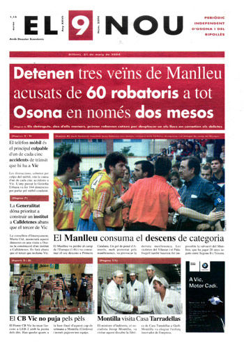 20040531 20040531 | El 9 Nou 31/05/2004 Notícies relacionades LA PREGUNTA Veu bé que el president dels bisbes espanyols opini sobre política? Sí No En aquesta enquesta han votat 288 persones. Vota Les + vistes Set detinguts i una vintena de denúncies en un dispositiu Kanpai contra la multireincidència a Vic i Manlleu La febre per trobar el número de loteria de l'anunci d'un torró ha arribat fins a Tona Fan malbé el ninot de l'escola Joan Maragall de Ripoll Obriran un centre privat de diagnòstic per la imatge a Vic amb una inversió de 6 milions d'euros Girbau celebra un dinar de jubilats a les portes de Nadal El personal sanitari del CAP del Remei de Vic fa un pessebre vivent solidari Osona Ripolles Els pobles osonencs que pertanyen a Girona no es plantegen demanar un canvi de província La Generalitat confirma el futur Palau de Justícia a l’Era d’en Sellés de Vic Aliança Catalana aconsegueix a última hora els suports per salvar 2,7 milions d'Europa per la nau del Pla de Ripoll