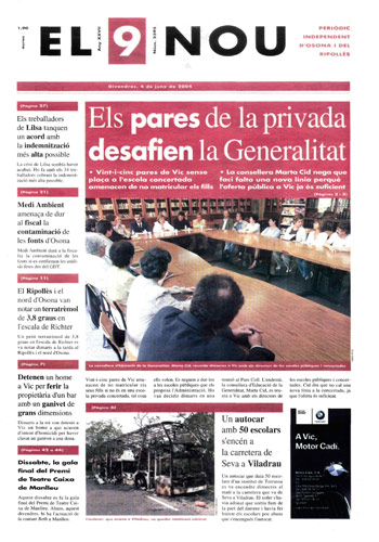 20040604 20040604 | El 9 Nou 04/06/2004 Notícies relacionades LA PREGUNTA Veu bé que el president dels bisbes espanyols opini sobre política? Sí No En aquesta enquesta han votat 288 persones. Vota Les + vistes Set detinguts i una vintena de denúncies en un dispositiu Kanpai contra la multireincidència a Vic i Manlleu La febre per trobar el número de loteria de l'anunci d'un torró ha arribat fins a Tona Fan malbé el ninot de l'escola Joan Maragall de Ripoll Obriran un centre privat de diagnòstic per la imatge a Vic amb una inversió de 6 milions d'euros Girbau celebra un dinar de jubilats a les portes de Nadal El personal sanitari del CAP del Remei de Vic fa un pessebre vivent solidari Osona Ripolles Els pobles osonencs que pertanyen a Girona no es plantegen demanar un canvi de província La Generalitat confirma el futur Palau de Justícia a l’Era d’en Sellés de Vic Aliança Catalana aconsegueix a última hora els suports per salvar 2,7 milions d'Europa per la nau del Pla de Ripoll