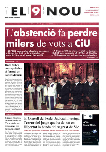 20040614 20040614 | El 9 Nou 14/06/2004 Notícies relacionades LA PREGUNTA Veu bé que el president dels bisbes espanyols opini sobre política? Sí No En aquesta enquesta han votat 288 persones. Vota Les + vistes Set detinguts i una vintena de denúncies en un dispositiu Kanpai contra la multireincidència a Vic i Manlleu La febre per trobar el número de loteria de l'anunci d'un torró ha arribat fins a Tona Fan malbé el ninot de l'escola Joan Maragall de Ripoll Obriran un centre privat de diagnòstic per la imatge a Vic amb una inversió de 6 milions d'euros Girbau celebra un dinar de jubilats a les portes de Nadal El personal sanitari del CAP del Remei de Vic fa un pessebre vivent solidari Osona Ripolles Els pobles osonencs que pertanyen a Girona no es plantegen demanar un canvi de província La Generalitat confirma el futur Palau de Justícia a l’Era d’en Sellés de Vic Aliança Catalana aconsegueix a última hora els suports per salvar 2,7 milions d'Europa per la nau del Pla de Ripoll