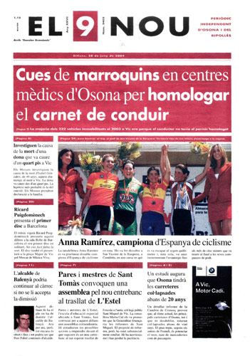 20040628 20040628 | El 9 Nou 28/06/2004 Notícies relacionades LA PREGUNTA Veu bé que el president dels bisbes espanyols opini sobre política? Sí No En aquesta enquesta han votat 288 persones. Vota Les + vistes Set detinguts i una vintena de denúncies en un dispositiu Kanpai contra la multireincidència a Vic i Manlleu La febre per trobar el número de loteria de l'anunci d'un torró ha arribat fins a Tona Fan malbé el ninot de l'escola Joan Maragall de Ripoll Obriran un centre privat de diagnòstic per la imatge a Vic amb una inversió de 6 milions d'euros Girbau celebra un dinar de jubilats a les portes de Nadal El personal sanitari del CAP del Remei de Vic fa un pessebre vivent solidari Osona Ripolles Els pobles osonencs que pertanyen a Girona no es plantegen demanar un canvi de província La Generalitat confirma el futur Palau de Justícia a l’Era d’en Sellés de Vic Aliança Catalana aconsegueix a última hora els suports per salvar 2,7 milions d'Europa per la nau del Pla de Ripoll