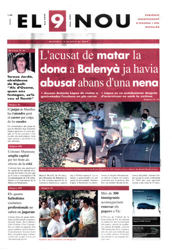 20040709 20040709 | El 9 Nou 09/07/2004 Notícies relacionades LA PREGUNTA Veu bé que el president dels bisbes espanyols opini sobre política? Sí No En aquesta enquesta han votat 288 persones. Vota Les + vistes Set detinguts i una vintena de denúncies en un dispositiu Kanpai contra la multireincidència a Vic i Manlleu La febre per trobar el número de loteria de l'anunci d'un torró ha arribat fins a Tona Fan malbé el ninot de l'escola Joan Maragall de Ripoll Obriran un centre privat de diagnòstic per la imatge a Vic amb una inversió de 6 milions d'euros Girbau celebra un dinar de jubilats a les portes de Nadal El personal sanitari del CAP del Remei de Vic fa un pessebre vivent solidari Osona Ripolles Els pobles osonencs que pertanyen a Girona no es plantegen demanar un canvi de província La Generalitat confirma el futur Palau de Justícia a l’Era d’en Sellés de Vic Aliança Catalana aconsegueix a última hora els suports per salvar 2,7 milions d'Europa per la nau del Pla de Ripoll