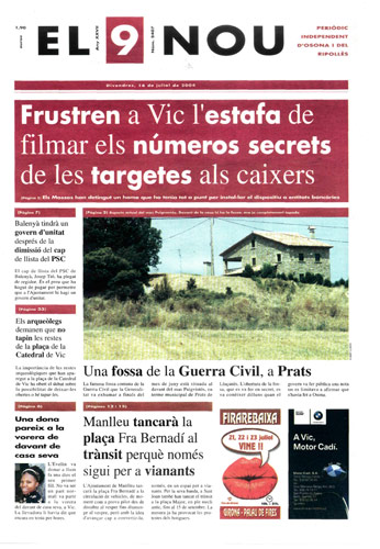 20040716 20040716 | El 9 Nou 16/07/2004 Notícies relacionades LA PREGUNTA Veu bé que el president dels bisbes espanyols opini sobre política? Sí No En aquesta enquesta han votat 297 persones. Vota Les + vistes Set detinguts i una vintena de denúncies en un dispositiu Kanpai contra la multireincidència a Vic i Manlleu Fan malbé el ninot de l'escola Joan Maragall de Ripoll Obriran un centre privat de diagnòstic per la imatge a Vic amb una inversió de 6 milions d'euros La febre per trobar el número de loteria de l'anunci d'un torró ha arribat fins a Tona El personal sanitari del CAP del Remei de Vic fa un pessebre vivent solidari Girbau celebra un dinar de jubilats a les portes de Nadal Els germans Pujol de la Granja Armengol, els nous 'influencers' de la vida a pagès La Generalitat confirma el futur Palau de Justícia a l’Era d’en Sellés de Vic Els pobles osonencs que pertanyen a Girona no es plantegen demanar un canvi de província Refredat, grip i covid: símptomes semblants però malalties diferents