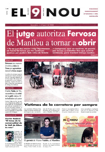 20040806 20040806 | El 9 Nou 06/08/2004 Notícies relacionades LA PREGUNTA Veu bé que el president dels bisbes espanyols opini sobre política? Sí No En aquesta enquesta han votat 293 persones. Vota Les + vistes Set detinguts i una vintena de denúncies en un dispositiu Kanpai contra la multireincidència a Vic i Manlleu La febre per trobar el número de loteria de l'anunci d'un torró ha arribat fins a Tona Fan malbé el ninot de l'escola Joan Maragall de Ripoll Obriran un centre privat de diagnòstic per la imatge a Vic amb una inversió de 6 milions d'euros Girbau celebra un dinar de jubilats a les portes de Nadal El personal sanitari del CAP del Remei de Vic fa un pessebre vivent solidari Osona Ripolles Els pobles osonencs que pertanyen a Girona no es plantegen demanar un canvi de província La Generalitat confirma el futur Palau de Justícia a l’Era d’en Sellés de Vic Aliança Catalana aconsegueix a última hora els suports per salvar 2,7 milions d'Europa per la nau del Pla de Ripoll