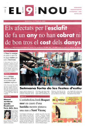 20040813 20040813 | El 9 Nou 13/08/2004 Notícies relacionades LA PREGUNTA Veu bé que el president dels bisbes espanyols opini sobre política? Sí No En aquesta enquesta han votat 297 persones. Vota Les + vistes Set detinguts i una vintena de denúncies en un dispositiu Kanpai contra la multireincidència a Vic i Manlleu Fan malbé el ninot de l'escola Joan Maragall de Ripoll Obriran un centre privat de diagnòstic per la imatge a Vic amb una inversió de 6 milions d'euros La febre per trobar el número de loteria de l'anunci d'un torró ha arribat fins a Tona El personal sanitari del CAP del Remei de Vic fa un pessebre vivent solidari Girbau celebra un dinar de jubilats a les portes de Nadal Els germans Pujol de la Granja Armengol, els nous 'influencers' de la vida a pagès La Generalitat confirma el futur Palau de Justícia a l’Era d’en Sellés de Vic Els pobles osonencs que pertanyen a Girona no es plantegen demanar un canvi de província Refredat, grip i covid: símptomes semblants però malalties diferents