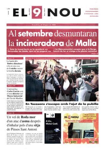 20040827 20040827 | El 9 Nou 27/08/2004 Notícies relacionades LA PREGUNTA Veu bé que el president dels bisbes espanyols opini sobre política? Sí No En aquesta enquesta han votat 288 persones. Vota Les + vistes Set detinguts i una vintena de denúncies en un dispositiu Kanpai contra la multireincidència a Vic i Manlleu La febre per trobar el número de loteria de l'anunci d'un torró ha arribat fins a Tona Fan malbé el ninot de l'escola Joan Maragall de Ripoll Obriran un centre privat de diagnòstic per la imatge a Vic amb una inversió de 6 milions d'euros Girbau celebra un dinar de jubilats a les portes de Nadal El personal sanitari del CAP del Remei de Vic fa un pessebre vivent solidari Osona Ripolles Els pobles osonencs que pertanyen a Girona no es plantegen demanar un canvi de província La Generalitat confirma el futur Palau de Justícia a l’Era d’en Sellés de Vic Aliança Catalana aconsegueix a última hora els suports per salvar 2,7 milions d'Europa per la nau del Pla de Ripoll