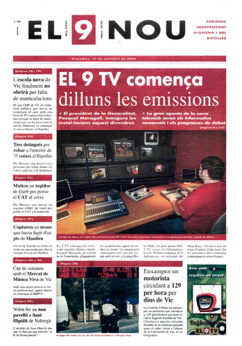 20040917 20040917 | El 9 Nou 17/09/2004 Notícies relacionades LA PREGUNTA Veu bé que el president dels bisbes espanyols opini sobre política? Sí No En aquesta enquesta han votat 288 persones. Vota Les + vistes Set detinguts i una vintena de denúncies en un dispositiu Kanpai contra la multireincidència a Vic i Manlleu La febre per trobar el número de loteria de l'anunci d'un torró ha arribat fins a Tona Fan malbé el ninot de l'escola Joan Maragall de Ripoll Obriran un centre privat de diagnòstic per la imatge a Vic amb una inversió de 6 milions d'euros Girbau celebra un dinar de jubilats a les portes de Nadal El personal sanitari del CAP del Remei de Vic fa un pessebre vivent solidari Osona Ripolles Els pobles osonencs que pertanyen a Girona no es plantegen demanar un canvi de província La Generalitat confirma el futur Palau de Justícia a l’Era d’en Sellés de Vic Aliança Catalana aconsegueix a última hora els suports per salvar 2,7 milions d'Europa per la nau del Pla de Ripoll