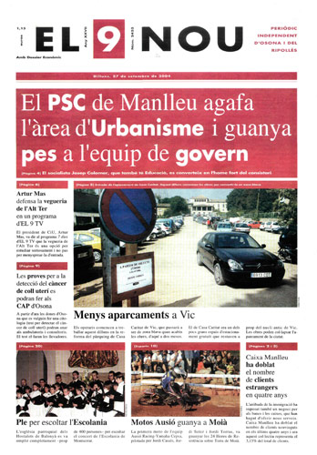 20040927 20040927 | El 9 Nou 27/09/2004 Notícies relacionades LA PREGUNTA Veu bé que el president dels bisbes espanyols opini sobre política? Sí No En aquesta enquesta han votat 288 persones. Vota Les + vistes Set detinguts i una vintena de denúncies en un dispositiu Kanpai contra la multireincidència a Vic i Manlleu La febre per trobar el número de loteria de l'anunci d'un torró ha arribat fins a Tona Fan malbé el ninot de l'escola Joan Maragall de Ripoll Obriran un centre privat de diagnòstic per la imatge a Vic amb una inversió de 6 milions d'euros Girbau celebra un dinar de jubilats a les portes de Nadal El personal sanitari del CAP del Remei de Vic fa un pessebre vivent solidari Osona Ripolles Els pobles osonencs que pertanyen a Girona no es plantegen demanar un canvi de província La Generalitat confirma el futur Palau de Justícia a l’Era d’en Sellés de Vic Aliança Catalana aconsegueix a última hora els suports per salvar 2,7 milions d'Europa per la nau del Pla de Ripoll