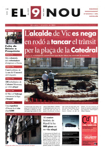20041001 20041001 | El 9 Nou 01/10/2004 Notícies relacionades LA PREGUNTA Veu bé que el president dels bisbes espanyols opini sobre política? Sí No En aquesta enquesta han votat 288 persones. Vota Les + vistes Set detinguts i una vintena de denúncies en un dispositiu Kanpai contra la multireincidència a Vic i Manlleu La febre per trobar el número de loteria de l'anunci d'un torró ha arribat fins a Tona Fan malbé el ninot de l'escola Joan Maragall de Ripoll Obriran un centre privat de diagnòstic per la imatge a Vic amb una inversió de 6 milions d'euros Girbau celebra un dinar de jubilats a les portes de Nadal El personal sanitari del CAP del Remei de Vic fa un pessebre vivent solidari Osona Ripolles Els pobles osonencs que pertanyen a Girona no es plantegen demanar un canvi de província La Generalitat confirma el futur Palau de Justícia a l’Era d’en Sellés de Vic Aliança Catalana aconsegueix a última hora els suports per salvar 2,7 milions d'Europa per la nau del Pla de Ripoll