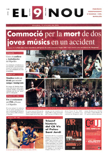 20041015 20041015 | El 9 Nou 15/10/2004 Notícies relacionades LA PREGUNTA Veu bé que el president dels bisbes espanyols opini sobre política? Sí No En aquesta enquesta han votat 293 persones. Vota Les + vistes Set detinguts i una vintena de denúncies en un dispositiu Kanpai contra la multireincidència a Vic i Manlleu La febre per trobar el número de loteria de l'anunci d'un torró ha arribat fins a Tona Fan malbé el ninot de l'escola Joan Maragall de Ripoll Obriran un centre privat de diagnòstic per la imatge a Vic amb una inversió de 6 milions d'euros Girbau celebra un dinar de jubilats a les portes de Nadal El personal sanitari del CAP del Remei de Vic fa un pessebre vivent solidari Osona Ripolles Els pobles osonencs que pertanyen a Girona no es plantegen demanar un canvi de província La Generalitat confirma el futur Palau de Justícia a l’Era d’en Sellés de Vic Aliança Catalana aconsegueix a última hora els suports per salvar 2,7 milions d'Europa per la nau del Pla de Ripoll