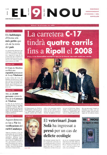 20041025 20041025 | El 9 Nou 25/10/2004 Notícies relacionades LA PREGUNTA Veu bé que el president dels bisbes espanyols opini sobre política? Sí No En aquesta enquesta han votat 297 persones. Vota Les + vistes Set detinguts i una vintena de denúncies en un dispositiu Kanpai contra la multireincidència a Vic i Manlleu Fan malbé el ninot de l'escola Joan Maragall de Ripoll Obriran un centre privat de diagnòstic per la imatge a Vic amb una inversió de 6 milions d'euros La febre per trobar el número de loteria de l'anunci d'un torró ha arribat fins a Tona El personal sanitari del CAP del Remei de Vic fa un pessebre vivent solidari Girbau celebra un dinar de jubilats a les portes de Nadal Els germans Pujol de la Granja Armengol, els nous 'influencers' de la vida a pagès La Generalitat confirma el futur Palau de Justícia a l’Era d’en Sellés de Vic Els pobles osonencs que pertanyen a Girona no es plantegen demanar un canvi de província Refredat, grip i covid: símptomes semblants però malalties diferents