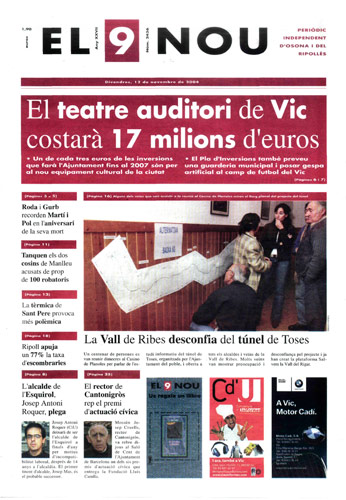 20041112 20041112 | El 9 Nou 12/11/2004 Notícies relacionades LA PREGUNTA Veu bé que el president dels bisbes espanyols opini sobre política? Sí No En aquesta enquesta han votat 297 persones. Vota Les + vistes Set detinguts i una vintena de denúncies en un dispositiu Kanpai contra la multireincidència a Vic i Manlleu Fan malbé el ninot de l'escola Joan Maragall de Ripoll Obriran un centre privat de diagnòstic per la imatge a Vic amb una inversió de 6 milions d'euros La febre per trobar el número de loteria de l'anunci d'un torró ha arribat fins a Tona El personal sanitari del CAP del Remei de Vic fa un pessebre vivent solidari Girbau celebra un dinar de jubilats a les portes de Nadal Els germans Pujol de la Granja Armengol, els nous 'influencers' de la vida a pagès La Generalitat confirma el futur Palau de Justícia a l’Era d’en Sellés de Vic Els pobles osonencs que pertanyen a Girona no es plantegen demanar un canvi de província Refredat, grip i covid: símptomes semblants però malalties diferents