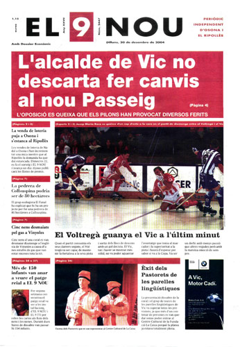 20041220 20041220 | El 9 Nou 20/12/2004 Notícies relacionades LA PREGUNTA Veu bé que el president dels bisbes espanyols opini sobre política? Sí No En aquesta enquesta han votat 253 persones. Vota Les + vistes Set detinguts i una vintena de denúncies en un dispositiu Kanpai contra la multireincidència a Vic i Manlleu La febre per trobar el número de loteria de l'anunci d'un torró ha arribat fins a Tona Fan malbé el ninot de l'escola Joan Maragall de Ripoll Obriran un centre privat de diagnòstic per la imatge a Vic amb una inversió de 6 milions d'euros Girbau celebra un dinar de jubilats a les portes de Nadal El personal sanitari del CAP del Remei de Vic fa un pessebre vivent solidari Osona Ripolles Els pobles osonencs que pertanyen a Girona no es plantegen demanar un canvi de província La Generalitat confirma el futur Palau de Justícia a l’Era d’en Sellés de Vic Aliança Catalana aconsegueix a última hora els suports per salvar 2,7 milions d'Europa per la nau del Pla de Ripoll