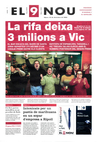 20041223 20041223 | El 9 Nou 23/12/2004 Notícies relacionades LA PREGUNTA Veu bé que el president dels bisbes espanyols opini sobre política? Sí No En aquesta enquesta han votat 245 persones. Vota Les + vistes Set detinguts i una vintena de denúncies en un dispositiu Kanpai contra la multireincidència a Vic i Manlleu La febre per trobar el número de loteria de l'anunci d'un torró ha arribat fins a Tona Fan malbé el ninot de l'escola Joan Maragall de Ripoll Obriran un centre privat de diagnòstic per la imatge a Vic amb una inversió de 6 milions d'euros Girbau celebra un dinar de jubilats a les portes de Nadal El personal sanitari del CAP del Remei de Vic fa un pessebre vivent solidari Osona Ripolles Els pobles osonencs que pertanyen a Girona no es plantegen demanar un canvi de província La Generalitat confirma el futur Palau de Justícia a l’Era d’en Sellés de Vic Aliança Catalana aconsegueix a última hora els suports per salvar 2,7 milions d'Europa per la nau del Pla de Ripoll