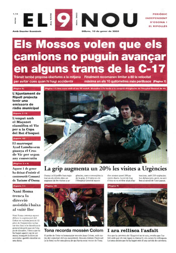 20050110 20050110 | El 9 Nou 10/01/2005 Notícies relacionades LA PREGUNTA Veu bé que el president dels bisbes espanyols opini sobre política? Sí No En aquesta enquesta han votat 245 persones. Vota Les + vistes Set detinguts i una vintena de denúncies en un dispositiu Kanpai contra la multireincidència a Vic i Manlleu La febre per trobar el número de loteria de l'anunci d'un torró ha arribat fins a Tona Fan malbé el ninot de l'escola Joan Maragall de Ripoll Obriran un centre privat de diagnòstic per la imatge a Vic amb una inversió de 6 milions d'euros Girbau celebra un dinar de jubilats a les portes de Nadal El personal sanitari del CAP del Remei de Vic fa un pessebre vivent solidari Osona Ripolles Els pobles osonencs que pertanyen a Girona no es plantegen demanar un canvi de província La Generalitat confirma el futur Palau de Justícia a l’Era d’en Sellés de Vic Aliança Catalana aconsegueix a última hora els suports per salvar 2,7 milions d'Europa per la nau del Pla de Ripoll