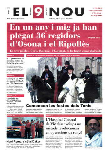 20050117 20050117 | El 9 Nou 17/01/2005 Notícies relacionades LA PREGUNTA Veu bé que el president dels bisbes espanyols opini sobre política? Sí No En aquesta enquesta han votat 245 persones. Vota Les + vistes Set detinguts i una vintena de denúncies en un dispositiu Kanpai contra la multireincidència a Vic i Manlleu La febre per trobar el número de loteria de l'anunci d'un torró ha arribat fins a Tona Fan malbé el ninot de l'escola Joan Maragall de Ripoll Obriran un centre privat de diagnòstic per la imatge a Vic amb una inversió de 6 milions d'euros Girbau celebra un dinar de jubilats a les portes de Nadal El personal sanitari del CAP del Remei de Vic fa un pessebre vivent solidari Osona Ripolles Els pobles osonencs que pertanyen a Girona no es plantegen demanar un canvi de província La Generalitat confirma el futur Palau de Justícia a l’Era d’en Sellés de Vic Aliança Catalana aconsegueix a última hora els suports per salvar 2,7 milions d'Europa per la nau del Pla de Ripoll