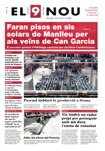 20050225 20050225 | El 9 Nou 25/02/2005 Notícies relacionades LA PREGUNTA Veu bé que el president dels bisbes espanyols opini sobre política? Sí No En aquesta enquesta han votat 280 persones. Vota Les + vistes Set detinguts i una vintena de denúncies en un dispositiu Kanpai contra la multireincidència a Vic i Manlleu La febre per trobar el número de loteria de l'anunci d'un torró ha arribat fins a Tona Fan malbé el ninot de l'escola Joan Maragall de Ripoll Obriran un centre privat de diagnòstic per la imatge a Vic amb una inversió de 6 milions d'euros Girbau celebra un dinar de jubilats a les portes de Nadal El personal sanitari del CAP del Remei de Vic fa un pessebre vivent solidari Osona Ripolles Els pobles osonencs que pertanyen a Girona no es plantegen demanar un canvi de província La Generalitat confirma el futur Palau de Justícia a l’Era d’en Sellés de Vic Aliança Catalana aconsegueix a última hora els suports per salvar 2,7 milions d'Europa per la nau del Pla de Ripoll