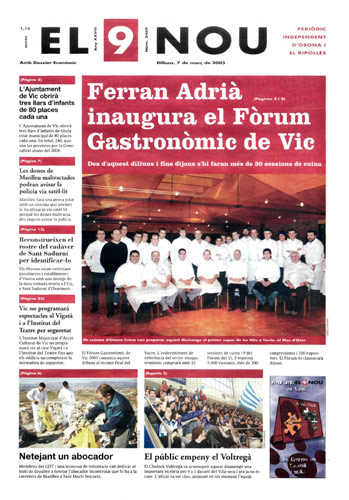 20050307 20050307 | El 9 Nou 07/03/2005 Notícies relacionades LA PREGUNTA Veu bé que el president dels bisbes espanyols opini sobre política? Sí No En aquesta enquesta han votat 291 persones. Vota Les + vistes Set detinguts i una vintena de denúncies en un dispositiu Kanpai contra la multireincidència a Vic i Manlleu La febre per trobar el número de loteria de l'anunci d'un torró ha arribat fins a Tona Fan malbé el ninot de l'escola Joan Maragall de Ripoll Obriran un centre privat de diagnòstic per la imatge a Vic amb una inversió de 6 milions d'euros Girbau celebra un dinar de jubilats a les portes de Nadal El personal sanitari del CAP del Remei de Vic fa un pessebre vivent solidari Osona Ripolles Els pobles osonencs que pertanyen a Girona no es plantegen demanar un canvi de província La Generalitat confirma el futur Palau de Justícia a l’Era d’en Sellés de Vic Aliança Catalana aconsegueix a última hora els suports per salvar 2,7 milions d'Europa per la nau del Pla de Ripoll