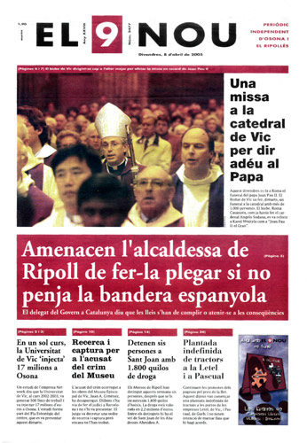 20050408 20050408 | El 9 Nou 08/04/2005 Notícies relacionades LA PREGUNTA Veu bé que el president dels bisbes espanyols opini sobre política? Sí No En aquesta enquesta han votat 291 persones. Vota Les + vistes Set detinguts i una vintena de denúncies en un dispositiu Kanpai contra la multireincidència a Vic i Manlleu La febre per trobar el número de loteria de l'anunci d'un torró ha arribat fins a Tona Fan malbé el ninot de l'escola Joan Maragall de Ripoll Obriran un centre privat de diagnòstic per la imatge a Vic amb una inversió de 6 milions d'euros Girbau celebra un dinar de jubilats a les portes de Nadal El personal sanitari del CAP del Remei de Vic fa un pessebre vivent solidari Osona Ripolles Els pobles osonencs que pertanyen a Girona no es plantegen demanar un canvi de província La Generalitat confirma el futur Palau de Justícia a l’Era d’en Sellés de Vic Aliança Catalana aconsegueix a última hora els suports per salvar 2,7 milions d'Europa per la nau del Pla de Ripoll