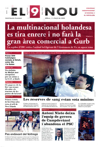20050411 20050411 | El 9 Nou 11/04/2005 Notícies relacionades LA PREGUNTA Veu bé que el president dels bisbes espanyols opini sobre política? Sí No En aquesta enquesta han votat 295 persones. Vota Les + vistes Set detinguts i una vintena de denúncies en un dispositiu Kanpai contra la multireincidència a Vic i Manlleu La febre per trobar el número de loteria de l'anunci d'un torró ha arribat fins a Tona Fan malbé el ninot de l'escola Joan Maragall de Ripoll Obriran un centre privat de diagnòstic per la imatge a Vic amb una inversió de 6 milions d'euros Girbau celebra un dinar de jubilats a les portes de Nadal El personal sanitari del CAP del Remei de Vic fa un pessebre vivent solidari Osona Ripolles Els pobles osonencs que pertanyen a Girona no es plantegen demanar un canvi de província La Generalitat confirma el futur Palau de Justícia a l’Era d’en Sellés de Vic Aliança Catalana aconsegueix a última hora els suports per salvar 2,7 milions d'Europa per la nau del Pla de Ripoll