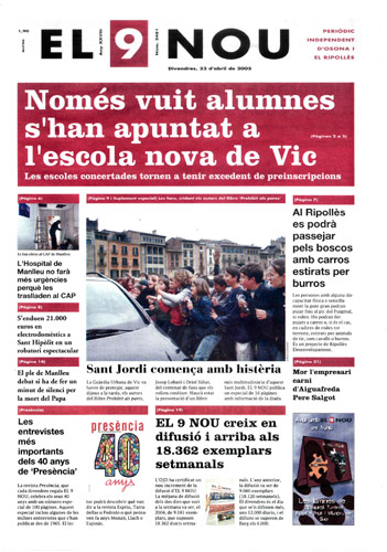 20050422 20050422 | El 9 Nou 22/04/2005 Notícies relacionades LA PREGUNTA Veu bé que el president dels bisbes espanyols opini sobre política? Sí No En aquesta enquesta han votat 295 persones. Vota Les + vistes Set detinguts i una vintena de denúncies en un dispositiu Kanpai contra la multireincidència a Vic i Manlleu La febre per trobar el número de loteria de l'anunci d'un torró ha arribat fins a Tona Fan malbé el ninot de l'escola Joan Maragall de Ripoll Obriran un centre privat de diagnòstic per la imatge a Vic amb una inversió de 6 milions d'euros Girbau celebra un dinar de jubilats a les portes de Nadal El personal sanitari del CAP del Remei de Vic fa un pessebre vivent solidari Osona Ripolles Els pobles osonencs que pertanyen a Girona no es plantegen demanar un canvi de província La Generalitat confirma el futur Palau de Justícia a l’Era d’en Sellés de Vic Aliança Catalana aconsegueix a última hora els suports per salvar 2,7 milions d'Europa per la nau del Pla de Ripoll