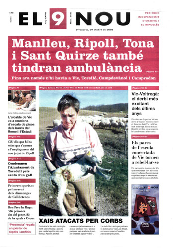 20050429 20050429 | El 9 Nou 29/04/2005 Notícies relacionades LA PREGUNTA Veu bé que el president dels bisbes espanyols opini sobre política? Sí No En aquesta enquesta han votat 280 persones. Vota Les + vistes Set detinguts i una vintena de denúncies en un dispositiu Kanpai contra la multireincidència a Vic i Manlleu La febre per trobar el número de loteria de l'anunci d'un torró ha arribat fins a Tona Fan malbé el ninot de l'escola Joan Maragall de Ripoll Obriran un centre privat de diagnòstic per la imatge a Vic amb una inversió de 6 milions d'euros Girbau celebra un dinar de jubilats a les portes de Nadal El personal sanitari del CAP del Remei de Vic fa un pessebre vivent solidari Osona Ripolles Els pobles osonencs que pertanyen a Girona no es plantegen demanar un canvi de província La Generalitat confirma el futur Palau de Justícia a l’Era d’en Sellés de Vic Aliança Catalana aconsegueix a última hora els suports per salvar 2,7 milions d'Europa per la nau del Pla de Ripoll