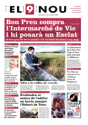 20050506 20050506 | El 9 Nou 06/05/2005 Notícies relacionades LA PREGUNTA Veu bé que el president dels bisbes espanyols opini sobre política? Sí No En aquesta enquesta han votat 295 persones. Vota Les + vistes Set detinguts i una vintena de denúncies en un dispositiu Kanpai contra la multireincidència a Vic i Manlleu La febre per trobar el número de loteria de l'anunci d'un torró ha arribat fins a Tona Fan malbé el ninot de l'escola Joan Maragall de Ripoll Obriran un centre privat de diagnòstic per la imatge a Vic amb una inversió de 6 milions d'euros Girbau celebra un dinar de jubilats a les portes de Nadal El personal sanitari del CAP del Remei de Vic fa un pessebre vivent solidari Osona Ripolles Els pobles osonencs que pertanyen a Girona no es plantegen demanar un canvi de província La Generalitat confirma el futur Palau de Justícia a l’Era d’en Sellés de Vic Aliança Catalana aconsegueix a última hora els suports per salvar 2,7 milions d'Europa per la nau del Pla de Ripoll