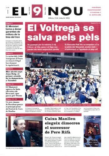 20050509 20050509 | El 9 Nou 09/05/2005 Notícies relacionades LA PREGUNTA Veu bé que el president dels bisbes espanyols opini sobre política? Sí No En aquesta enquesta han votat 298 persones. Vota Les + vistes Set detinguts i una vintena de denúncies en un dispositiu Kanpai contra la multireincidència a Vic i Manlleu Fan malbé el ninot de l'escola Joan Maragall de Ripoll Obriran un centre privat de diagnòstic per la imatge a Vic amb una inversió de 6 milions d'euros La febre per trobar el número de loteria de l'anunci d'un torró ha arribat fins a Tona El personal sanitari del CAP del Remei de Vic fa un pessebre vivent solidari Girbau celebra un dinar de jubilats a les portes de Nadal Els germans Pujol de la Granja Armengol, els nous 'influencers' de la vida a pagès La Generalitat confirma el futur Palau de Justícia a l’Era d’en Sellés de Vic Els pobles osonencs que pertanyen a Girona no es plantegen demanar un canvi de província Refredat, grip i covid: símptomes semblants però malalties diferents