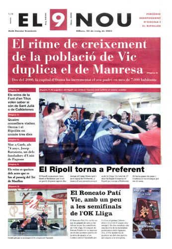 20050523 20050523 | El 9 Nou 23/05/2005 Notícies relacionades LA PREGUNTA Veu bé que el president dels bisbes espanyols opini sobre política? Sí No En aquesta enquesta han votat 295 persones. Vota Les + vistes Set detinguts i una vintena de denúncies en un dispositiu Kanpai contra la multireincidència a Vic i Manlleu La febre per trobar el número de loteria de l'anunci d'un torró ha arribat fins a Tona Fan malbé el ninot de l'escola Joan Maragall de Ripoll Obriran un centre privat de diagnòstic per la imatge a Vic amb una inversió de 6 milions d'euros Girbau celebra un dinar de jubilats a les portes de Nadal El personal sanitari del CAP del Remei de Vic fa un pessebre vivent solidari Osona Ripolles Els pobles osonencs que pertanyen a Girona no es plantegen demanar un canvi de província La Generalitat confirma el futur Palau de Justícia a l’Era d’en Sellés de Vic Aliança Catalana aconsegueix a última hora els suports per salvar 2,7 milions d'Europa per la nau del Pla de Ripoll