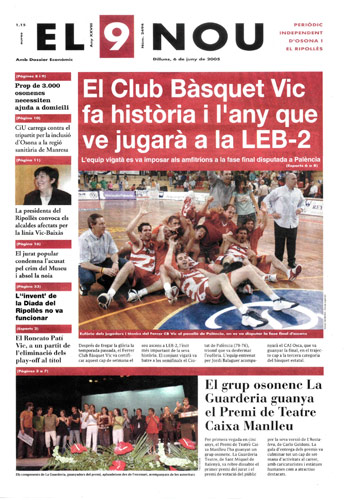 20050606 20050606 | El 9 Nou 06/06/2005 Notícies relacionades LA PREGUNTA Veu bé que el president dels bisbes espanyols opini sobre política? Sí No En aquesta enquesta han votat 291 persones. Vota Les + vistes Set detinguts i una vintena de denúncies en un dispositiu Kanpai contra la multireincidència a Vic i Manlleu La febre per trobar el número de loteria de l'anunci d'un torró ha arribat fins a Tona Fan malbé el ninot de l'escola Joan Maragall de Ripoll Obriran un centre privat de diagnòstic per la imatge a Vic amb una inversió de 6 milions d'euros Girbau celebra un dinar de jubilats a les portes de Nadal El personal sanitari del CAP del Remei de Vic fa un pessebre vivent solidari Osona Ripolles Els pobles osonencs que pertanyen a Girona no es plantegen demanar un canvi de província La Generalitat confirma el futur Palau de Justícia a l’Era d’en Sellés de Vic Aliança Catalana aconsegueix a última hora els suports per salvar 2,7 milions d'Europa per la nau del Pla de Ripoll